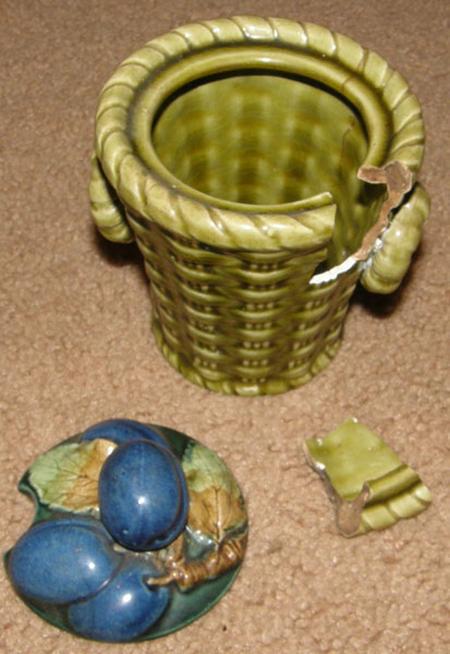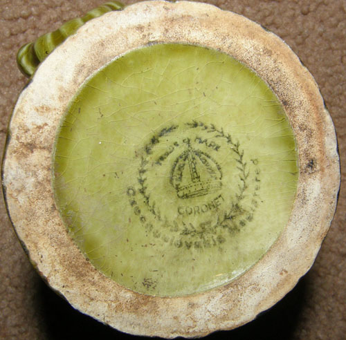 Vintage jam or jelly jar with lid. Stamped Trade Mark Coronet with a crown on the bottom, this has been in the owners family for over 50 yrs. Bottom is made to look like a basket with 2 handles & lid looks like blue grapes or plums with leaves, 1 piece of fruit as the handle on lid & has a cut out for tiny spoon. Bottom has several cracks & a piece broke out when washing, so basically you are buying the lid in case you are missing one or have broken yours. No chips, cracks or breaks to lid that we can see or feel. Jar measures approx 4" high x 3 3/4" diameter. If you prefer us to ship just the lid, please let us know when ordering.