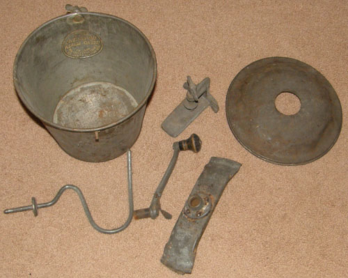 Old fashioned hand-cranked Bread Maker from the early 1900's in New England. Four part No. 2 Universal Bread Maker manufactured by Landers, Frary & Clark, New Britain, Conn. consists of dough pail, hook with wooden crank handle, lid and a table clamp. Dough pail is approx 8" high with 8 1/2" diameter, & wooden handled crank turns hook inside pail. The last readable patent date on it is Dec 25, 1906. A country kitchen workhorse with an old patina of rust, but still works.