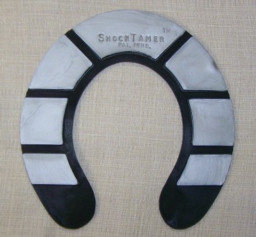 Designed like the sole of a jogging shoe, ShockTamer dual-density hoof pads are an effective aid in treating sore feet or relieving lameness & can serve as a prevenative measure against future hoof & leg problems. The softer gray polyurethane is the shock absorber while the harder black frame provides support & is the shock dissipater. Gives improved performance & less fatigue on performance horses. Fits up to a size 2. Measures 5 5/8" from side to side, 5 1/2" from toe to heel & 3/8" thick. Sold as a pair.