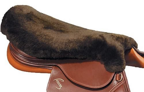 This top-quality, soft, dense Australian Merino wool sheepskin seat saver has 1 elastic/velcro strap that runs front to back & elastic panel slips over cantle in back, plus there is elastic that runs side to side. 17” long from front gullet to back & approx 10” wide. Protects your saddle and provides a soft cushioned ride. Fits most English saddles. A must have item for the serious trail rider. Soften the blow of those hard saddle seats, those with bad backs, sore buts or for those who spend long hours in the saddle.