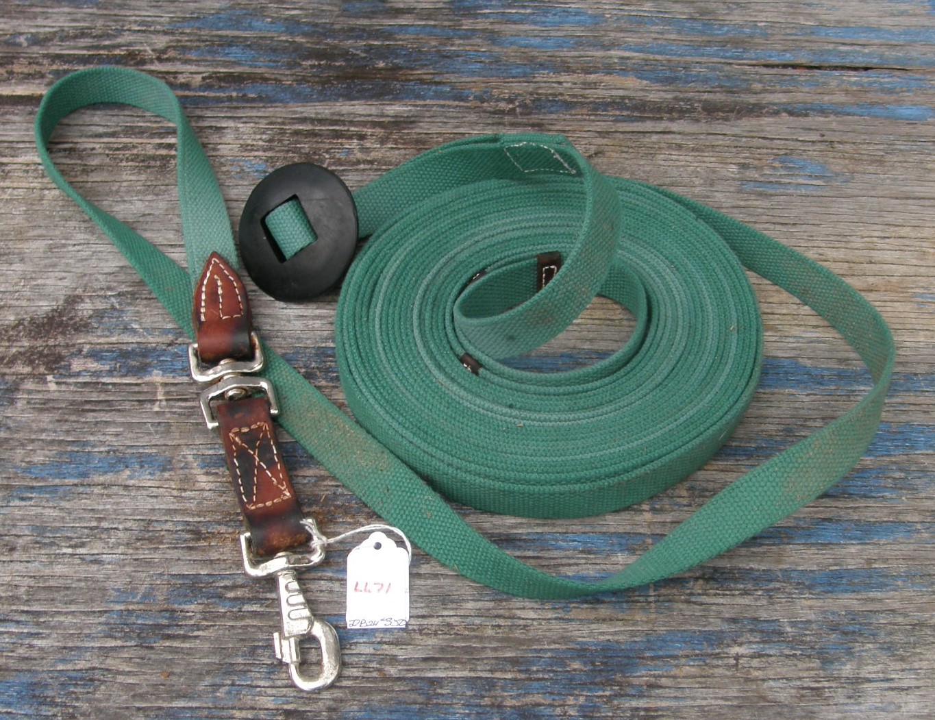 1” single ply nylon with loop hand hold, swivel bolt snap & 20" chain. Total length approx 20 1/2'. Great for ponies or smaller horses where you don't need all that length of line. Minor dirt or stains, excellent used condition.