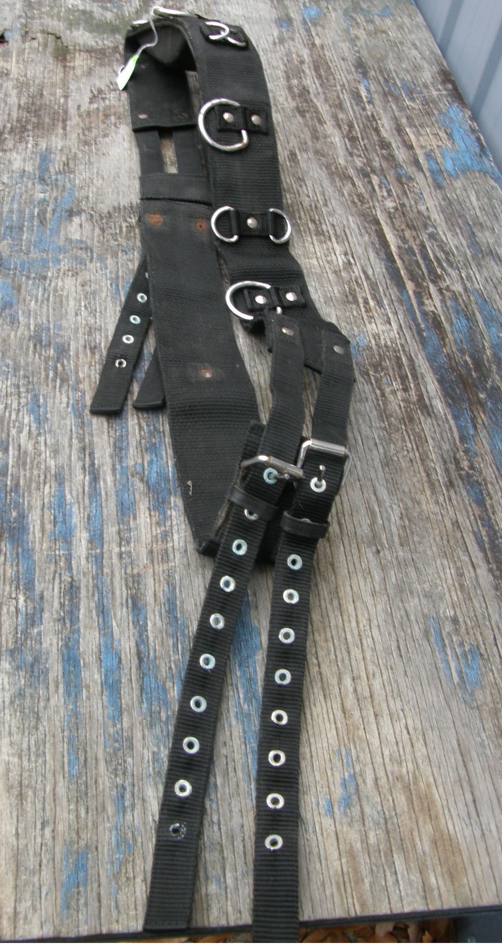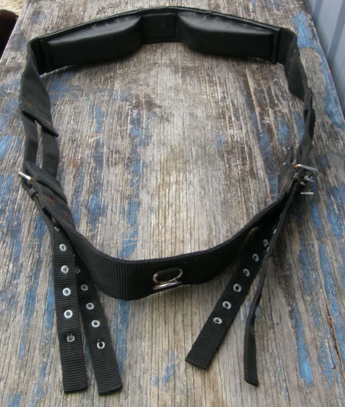 This economical & well engineered training surcingle has heavy duty 3\rdblquote nylon web construction with padding on each side of withers to prevent shifting, rings & D's properly located for crupper, over check and reins or side reins. Ideal for most schooling needs. Straps allow adjustment on both sides to equalize pressure. Great to use when training, head setting, line driving or preparing a horse to drive. Clean & in good used condition with some rust on hardware, but all rings & buckles move well. Girth measures 21 1/2" buckle to buckle & overall measurement is 69" at smallest & 88" at largest.