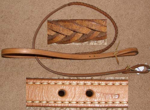 5/8” wide leather contest rein with braided leather center/handhold area, conway buckles with additional adjustment holes punched on 1 side & is just under 6' long. Leather in good condition, supple & not stiff. No snaps but easy to add. Brand unknown.