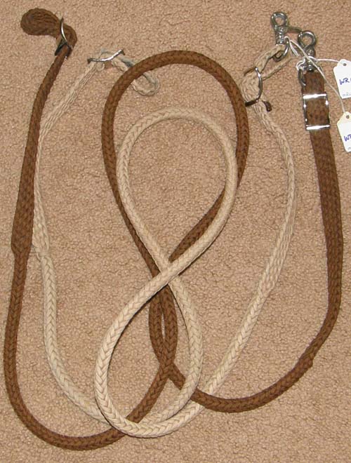 Natural soft 1" wide flat braided cotton roping or gaming rein with trigger/scissor snaps, suede reinforcement, & measures over 7 1/2' long. 2 available.