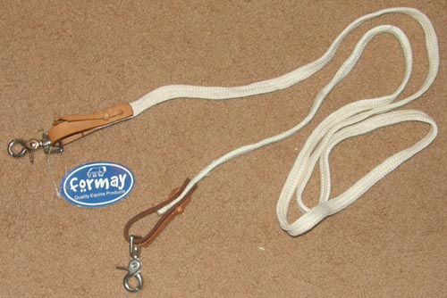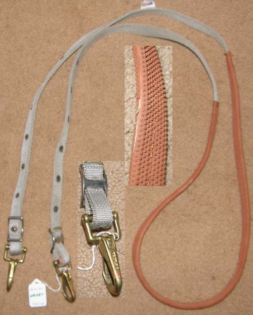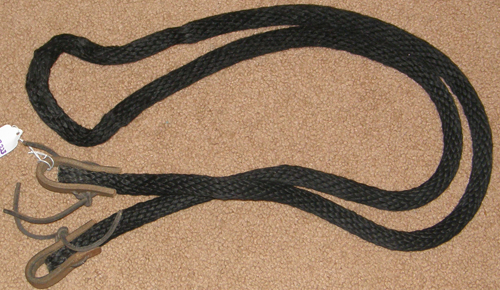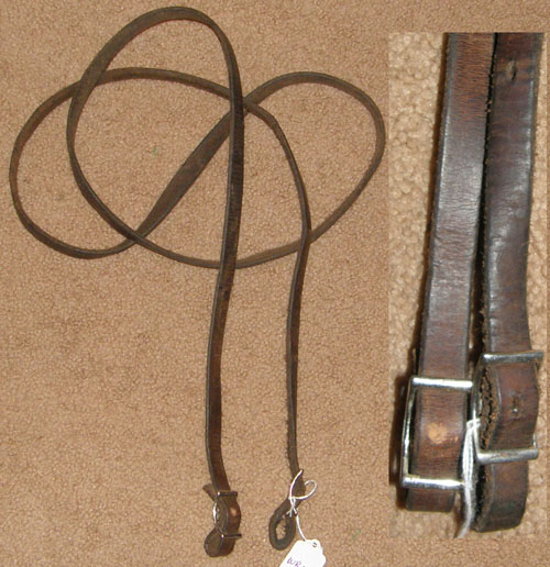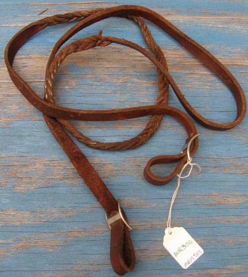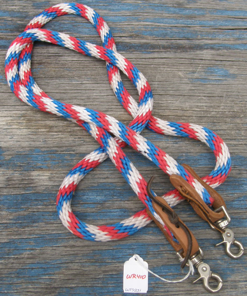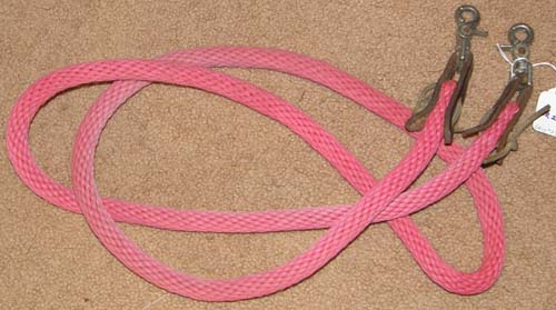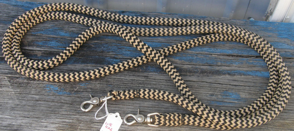 3/4" wide flat braided nylon gaming or roping reins with conway bukle adjustment & single snap end. Measures 8' long & is light in your hands. We have 2 of these: 1 has tag & trigger/scissor snap end, snap is slightly corroded but works well. 1 has no tag & has a spring snap end. Please specify which 1 you prefer when ordering.