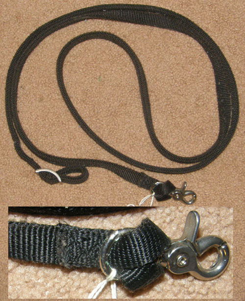 Soft doubled & stitched 3/4” single nylon rein with sewn in brass scissor/trigger snap on 1 end & is almost 6' long. Easy to punch holes & add conway buckle & snap to other end, or use as a replacement for a missing rein as is, dog leash, or lead for mini horse, pony, etc. Excellent condition, just cleaned, snap doesn't swivel but works fine otherwise.