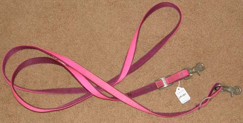 3/4” doubled & stitched nylon western roping or gaming reins with removable/replaceable trigger/scissor snaps, conway buckle adjustable, & measures almost 9' including snaps. Burgundy bottom layer, pink top layer. Minor corrosion on snaps & buckles, some dirt/stains mainly on pink side, but just cleaned.