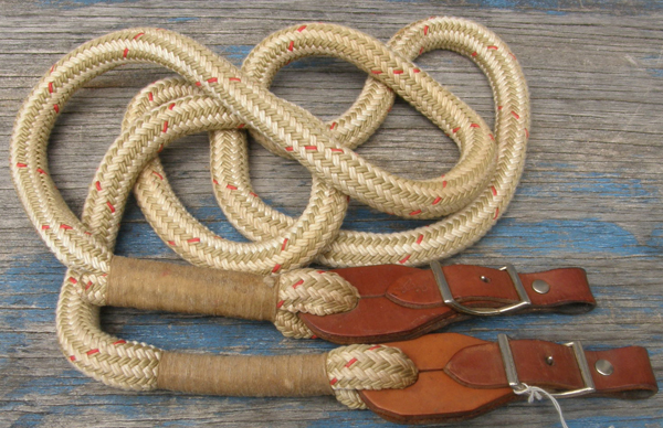 3/4” poly rope western roping or gaming reins with sturdy harness leather water loop ends, & measures approx 7'. Has a kink in middle from being knotted, & minor surface cracking on 1 leather end, otherwise good used condition. Water loops are not original so if it was stamped a brand it isn't now so brand unknown.