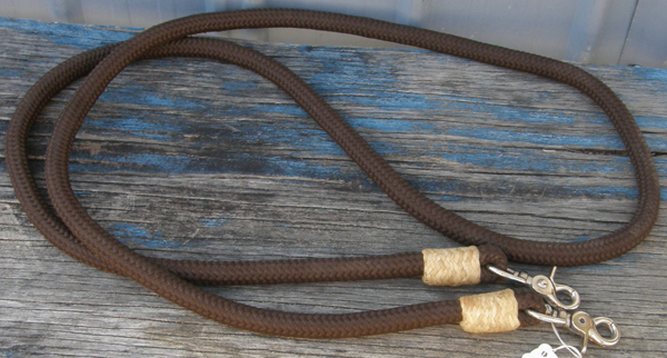 5/8” poly rope western gaming or roping reins with natural braided rawhide trim ends & trigger/scissor snaps at both ends. Just over 7' long & is a soft rope. Brand unknown.