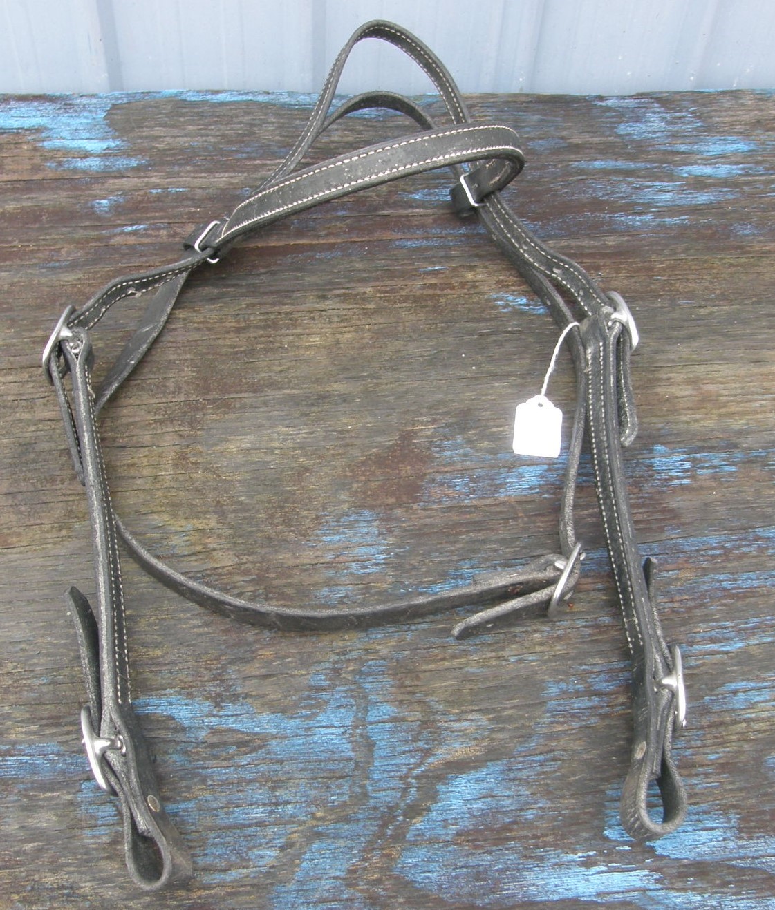 Browband style western headstall with white stitched harness leather with rubbed edges, buckle throatlatch, metal bridle rosettes, & cheek adjusts on one side with leather ties at bit ends. 5 factory punched holes plus 3 more added further up on crown to make smaller. Great for pleasure or work. Rust/corrosion to bridle rosettes, but leather is soft & supple. Brand unknown.