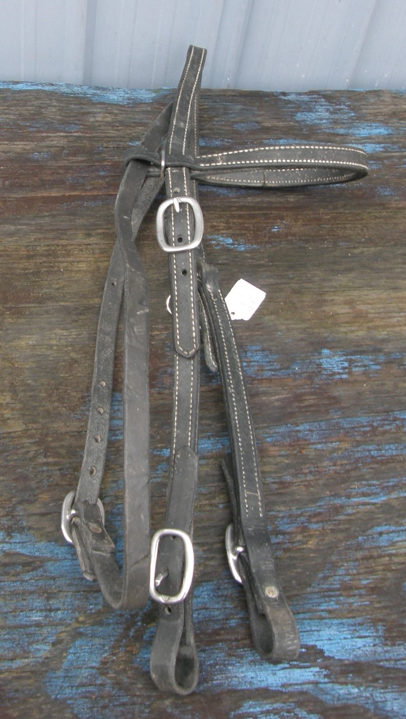 Browband style western headstall doubled & stitched with white contrasting stitching, cheeks that adjust on both sides, & Chicago screws at bit ends. 5 holes punched on both sides for lots of sizing options. Great for pleasure, trail or work. Great headstall for trainers who need headstalls to hang bits on, so they don't have to keep changing bits while breaking colts. Some stains, mainly to crown piece. Brand unknown.