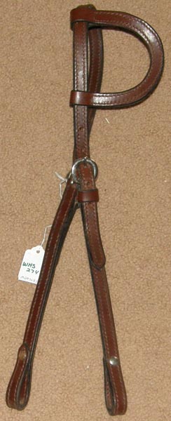 Sturdy 5/8" harness leather browband style western headstall with rubbed edges, cheeks that adjust on both sides, & has latigo string ties at bit ends. Measures 41 1/2" at middle adjustment with 8 factory punched holes on each side. Stamped Pernokas on cheek, leather is sturdy yet supple but not pretty as the salts either in the hide or tanning process have left a film in spots. Use for work or pleasure. Great for trainers who need headstalls to hang different bits. Pernokas Saddlery states their headstalls start at $50.