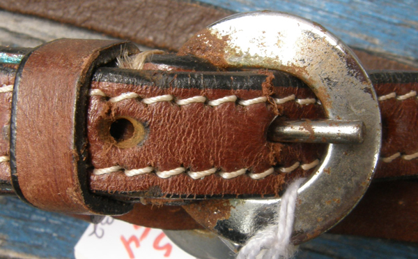 Western headstall with futurity or knotted browband style, doubled & stitched with rubbed & darkened edges, engraved "silver" trim on browband, engraved "silver" buckles & keepers on both sides & on throatlatch, & small engraved conchos at bit ends. Buckles attach with Chicago screws so can be changed. Headstall adjusts on both sides with 5 holes & measures 37" at smallest & 45" at largest adjustment. Throatlatch end is stamped Silver Royal. Leather is nice & supple, & feels like a Weaver or Tory leather, but 1 cheek is slightly different than the other. It may have come that way as it was used & worn evenly with the other cheek(see photo inset). Only flaw we can find is it looks like the buckle cut the top layer of leather around 1 hole(see photo) but is not unsafe to use as it is as it is only a surface layer.