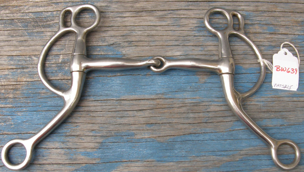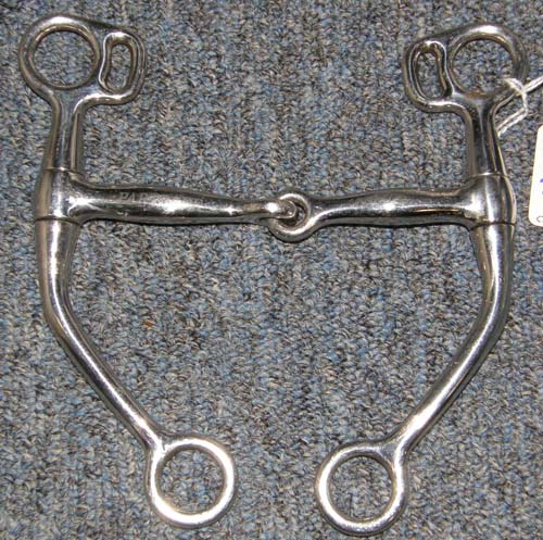 5" jointed snaffle mouthpiece with 7” Foreman style shanks. This makes a great transition or training bit as rings on shanks offer various rein placement options, large ring for a direct rein or bottom ring for a leverage action. Brand unknown.