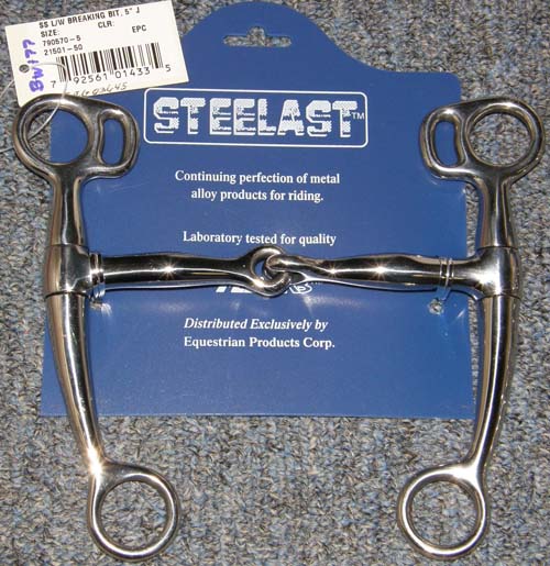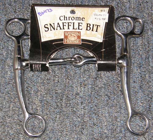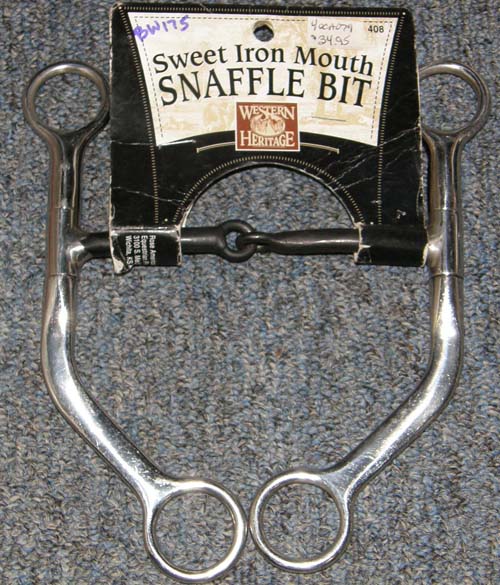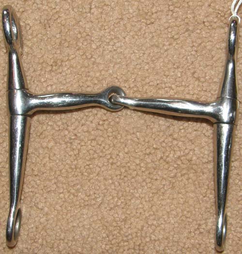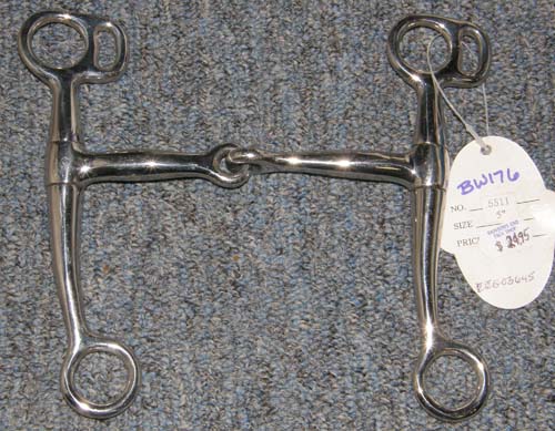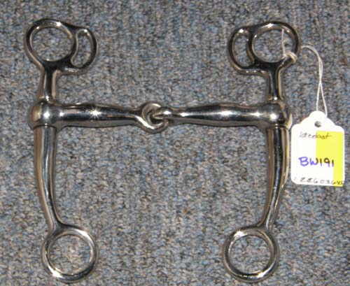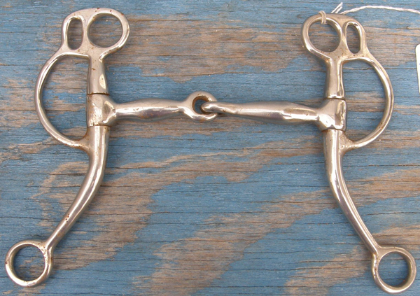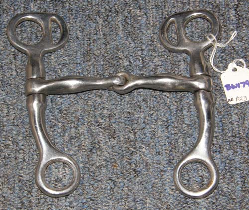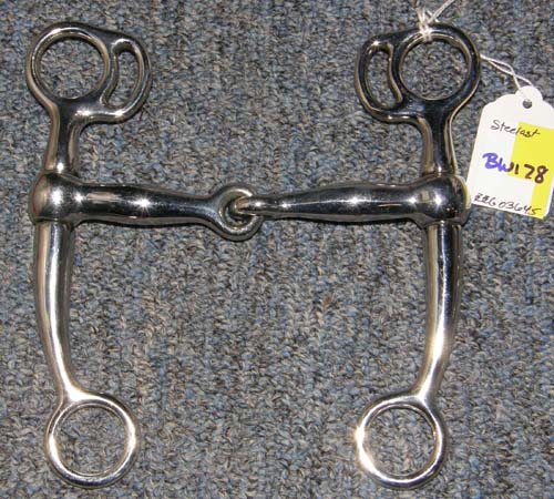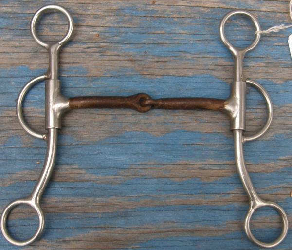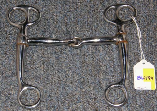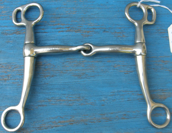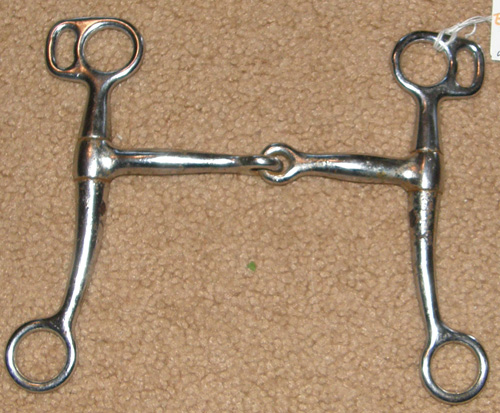 4 3/4” jointed snaffle mouthpiece with 6” shanks. Great training bit for young stock or basic bit for seasoned horses. Brand unknown.