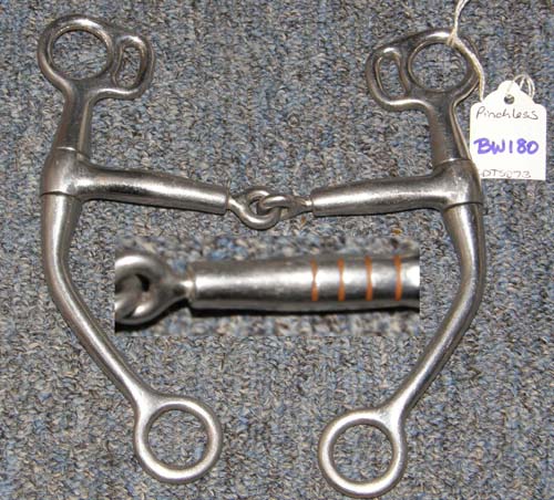 5” jointed snaffle mouthpiece inlaid with copper, with pinchless center swivel & 7” slightly turned back shanks. The unique center swivel eliminates pinching of the tongue. Designed to instruct by gentle pressure, not by pain or pain avoidance. Internal bushing on both sides of the mouthpiece junction permits either side of the bit to rotate independently of the other side. Nothing in the mouthpiece will entrap the horses tongue, bruise the horses palate or pinch the horses cheek. As a result, the riders instructions will be perfectly clear and without confusion. Copper inlay helps keep mouth moist & responsive. Good used condition with some chew scratches to mouthpiece, but no rough surfaces. Not marked but should be a Robart Pinchless bit.