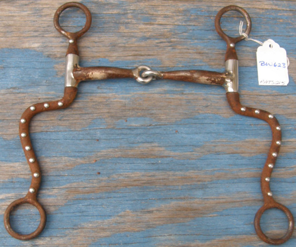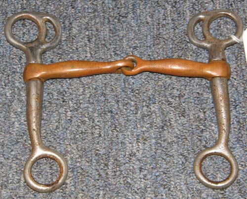 5" copper jointed snaffle mouthpiece with almost 7 1/2” Foreman style slightly turned back loose shanks. This makes a great transition or training bit as rings on shanks offer various rein placement options, large ring for a direct rein or bottom ring for a leverage action. Brand unknown. A fairly heavy bit.