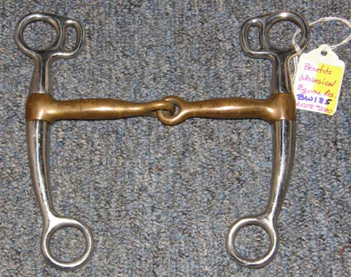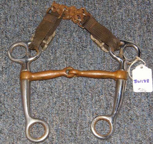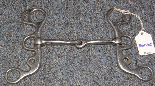 4 3/4” snaffle mouthpiece with alternating copper & stainless steel rollers & 7” swept back shanks. Great transition bit from snaffle to curb bit, or for an easy mouthed horse that needs something to play with. Brand unknown.