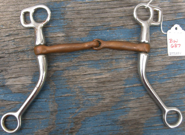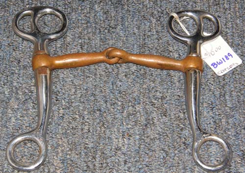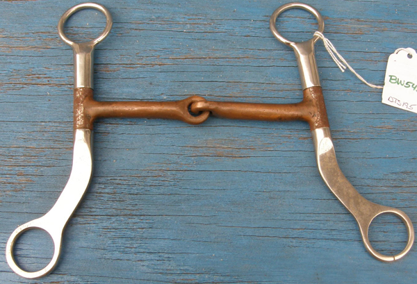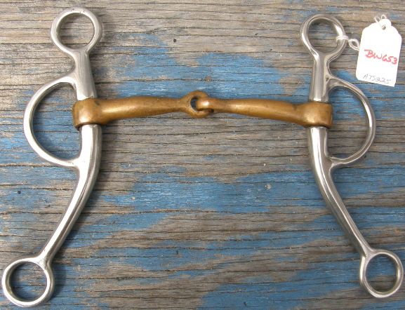 5” copper jointed snaffle mouthpiece with 6” shanks. Great training bit for young stock or basic bit for seasoned horses. Copper mouthpiece keeps mouth moist & responsive. Good used condition but does have some flaking on cheeks.