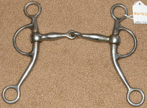 Tight 5" jointed snaffle mouthpiece with almost 7” Foreman style shanks. This makes a great transition or training bit as rings on shanks offer various rein placement options, large ring for a direct rein or bottom ring for a leverage action. Brand unknown.