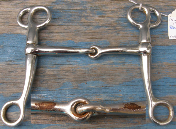 5” chrome plated snaffle mouthpiece with copper inlay & 7 3/4" fancy engraved aluminum shanks that look like engraved silver. This bit is relatively light weight. Makes a nice show bit for a horse who doesn't like to carry alot of weight in their mouth. Some minor rust on snaffle mouthpiece. Partrade's Rocking P brand mark on inside of shank.