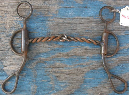 5 1/2” sweet iron twisted wire jointed snaffle mouthpiece with 7" Loomis style loose shanks. This makes a great transition or training bit as rings on shanks offer various rein placement options, large ring for a direct rein or bottom ring for a leverage action. Longer shanks give more leverage. Black steel/sweet iron is untreated so it does rust, but some horses prefer the rust as it promotes a moist & responsive mouth. Brand unknown but a faint DT(?) on 1 shank. Some rust throughout.