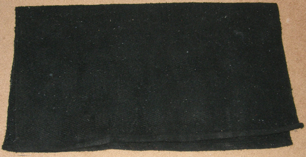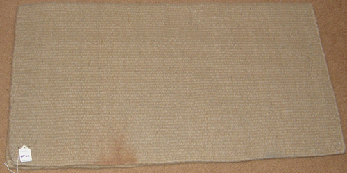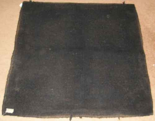 Great solid color single fold western show blanket or use as a rug. Single fold, use with a pad or alone. Measures approx 35" long x 34" wide, so great for longer skirted saddles. Clean as it was used over a pad, can't really tell it was used except for dirt line rimming the underside edges. Tag unreadable(see photo), so brand unknown, possibly Mayatex.