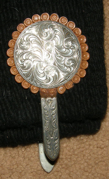 Great solid color show blanket with shiny black vinyl wear leathers & 2 1/2" diameter tooled lt oil leather "concho" sewn on with engraved silver concho on top & silver drop. Should be a 90% wool/10% polyester blend blanket. Excellent condition with only some minor wear to wear leathers, minor dirt & chestnut/white hairs to underside, mainly along back edge(see photo). Took the conchos off to clean & 1 has the original price sticker of $40(would be more now) but no markings & silver drop piece is stamped on back Overlaid Sterling Silver Mexico. Quality blanket but brand unknown, possibly an older Mayatex, Circle Y, etc. Measures 32" long x 36" wide. Don't like the price? We can remove the silver & leather conchos as that is where the money is.