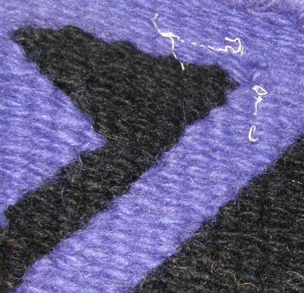 Woven western single fold show blanket in a zipper pattern. Measures 34"L x 36"W. Excellent used condition with minor hairs & dirt on underside. Can't read label but this is a Mayatex. A few small snag/pulls on left side that are hidden by saddle.