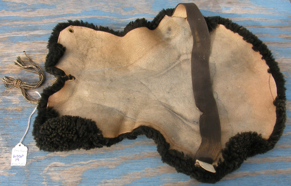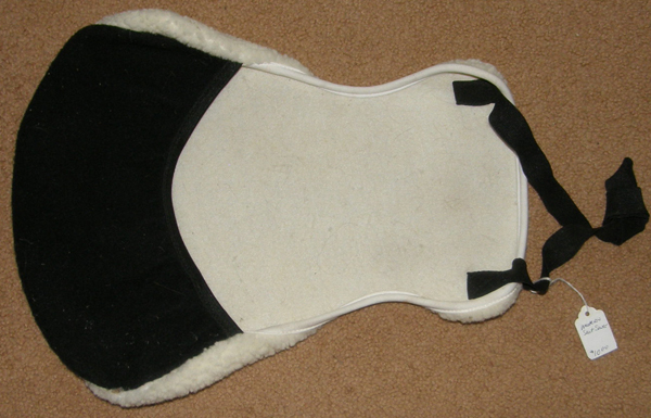 This 100% wool sheepskin seat saver has an 1 1/8" wide elastic strap in front for attaching around saddle horn & elastic panel in back that slips over cantle to hold it in place. Protects your saddle and provides a soft cushioned ride. Measures 16" long. Fits most Western & Western style Australian stock saddles. A must have item for the serious trail rider. Brand unknown. Fleece top look slike new but has tiny hole on back side & elastic back panel has a small repaired rip(see photo).