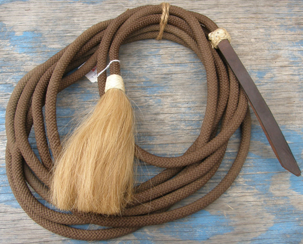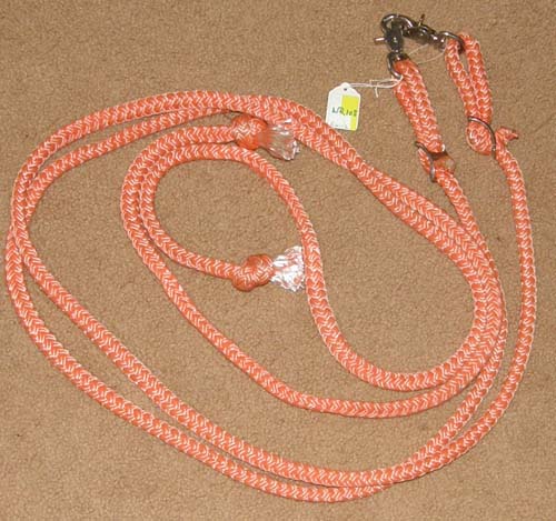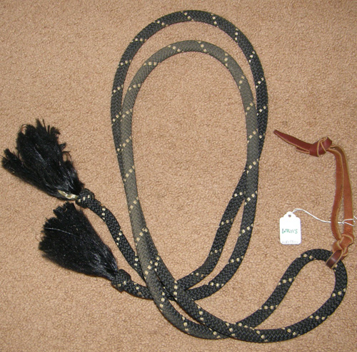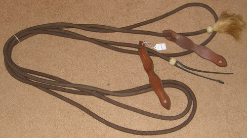 1/2” wide poly rope reins approx 22 1/2' long including 8 1/2" leather popper on 1 end, & 6 1/2" horse hair tassel at other end. Braided rawhide trim on both ends. Can be used with snaffle bit or a bosal. Rawhide trim on end with leather poppers shows wear on 1 side otherwise excellent used condition.