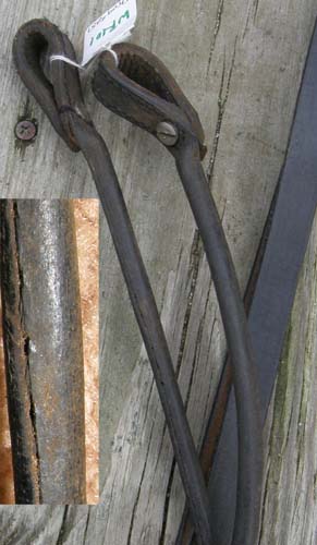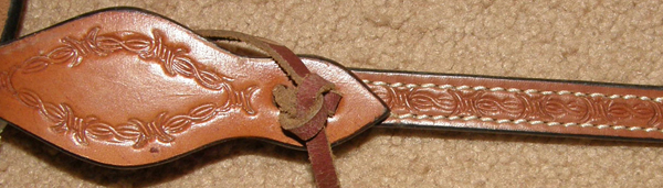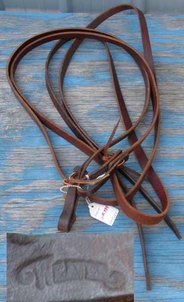 5/8” wide western split reins approx 8' long with shaped barbed wire tooled ends at bit end with leather ties, rubbed & darkened edges, & barbed wire tooled & stitched for the 1st 16". Because ends flare out, it is best to add snaps to ends as it may not fit inside some bit rings or use as snaffle bit reins.