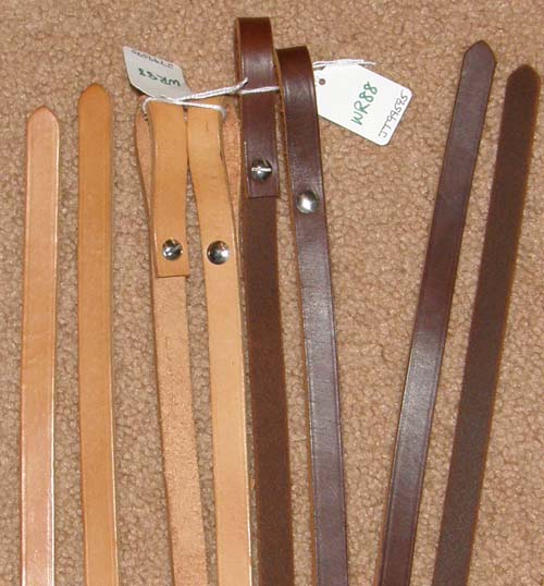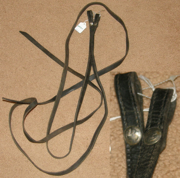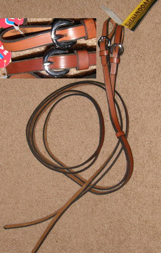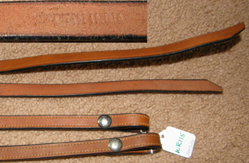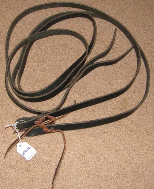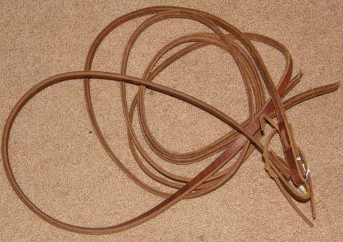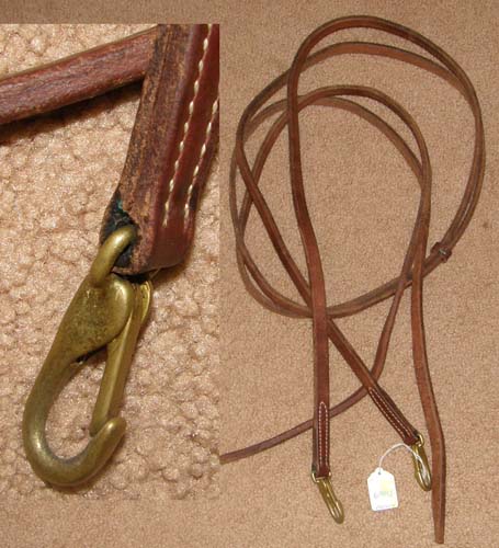 5/8” wide premium harness leather western split reins with sewn in brass spring snaps at bit ends & is a little over 7' long with sliding leather keeper. Makes great training reins as easy to change on bits & headstalls. Heavy duty & excellent quality. Brand unknown but similar to Schutz Bros, Weaver, etc.