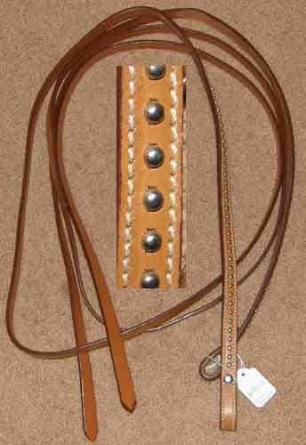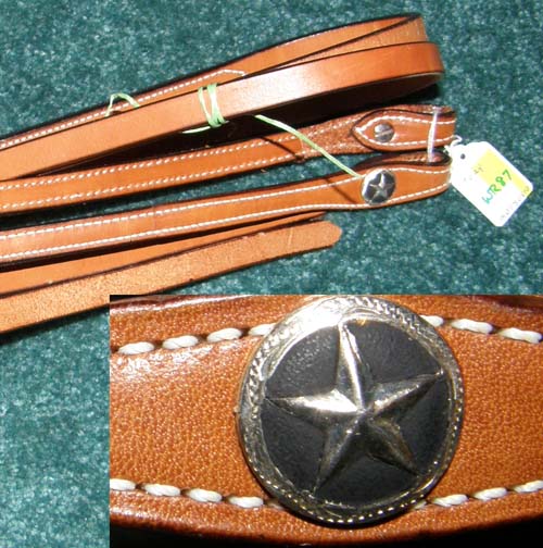 5/8” light oil bridle leather western split reins with darkened edges, doubled & stitched for the 1st 3' of reins, a little over 7' long, & fancy "silver" star on black background concho with scalloped or shaped leather at bit ends. Nice enough for show, quality enough to hold up to work.