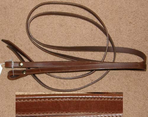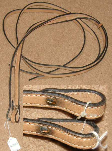 5/8" wide leather western split reins with white contrast stitching for 1st 19", has rubbed & darkened edges, Chicago screws at bit end, sliding leather keeper, & is 6 1/2' long. New, but screw heads have caused a slight discoloration & have a touch of rust. Brand unknown but these are soft & drape very well.