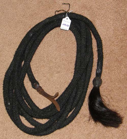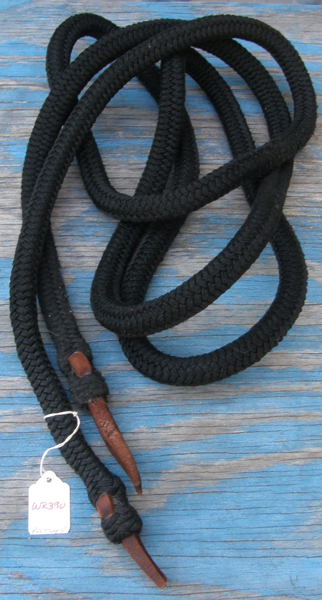 For use with a bosal, these 5/8” wide black poly rope reins are approx 21' long including leather popper on 1 end, & 6" long black horse hair tassel with braided black rawhide ball. Comfortable in your hands, these coil & drape well, great for breaking young horses or use for showing. Excellent used condition, a few small areas of wear where it was tied around bosal, but won't be seen if you tie in same area.