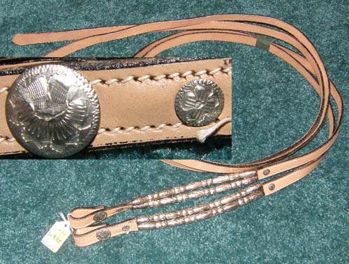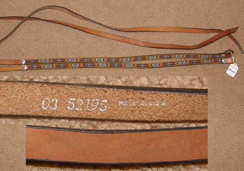 5/8” wide western split reins a little over 7' long with a southwestern or Indian print design overlay on 1st 2' of reins bordered with "silver" conchos at bit ends, & rubbed/darkened edges. Design overlay is made to look like braided horsehair or seed beads. Nice supple leather reins. Made by Tex Tan, it is stamped 03 52195 & Made in USA on both reins.