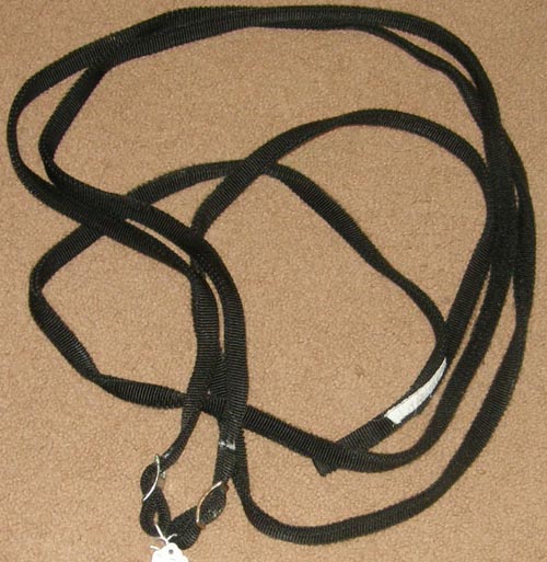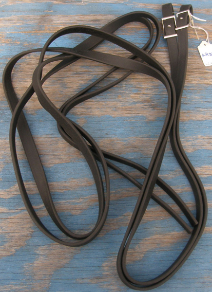 5/8” wide black synthetic Beta Biothane or vinyl coated nylon rein just over 7' long with stainless steel conway buckles at bit ends. These reins feel great in the hand, are super strong, & easy to care for with no oiling needed. They can be cleaned with mild soap & water. Biothane is impervious to sweat, will not stain, & the non-stretch material prevents unevenness. Great for everyday riding, ranch work, & the trail. Brand unknown.