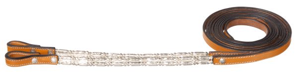 3/4” light oil leather split western show reins with darkened edges, almost 7' long, white contrast stitching, 7” double row of "silver" ferrule beads, small "silver" conchos & fancy etched Chicago screws at bit ends. Silver ferrule beads makes this a heavier weighted rein, great for keeping show horses head down.
