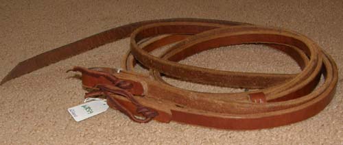5/8” wide latigo leather western split reins with water loop with tie ends & is 7' long. Sturdy yet quality leather. A few minor dings, more from store handling than from use, otherwise excellent condition. Stamped Weaver on 1 water loop.