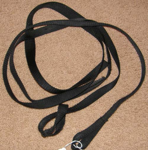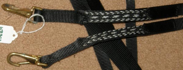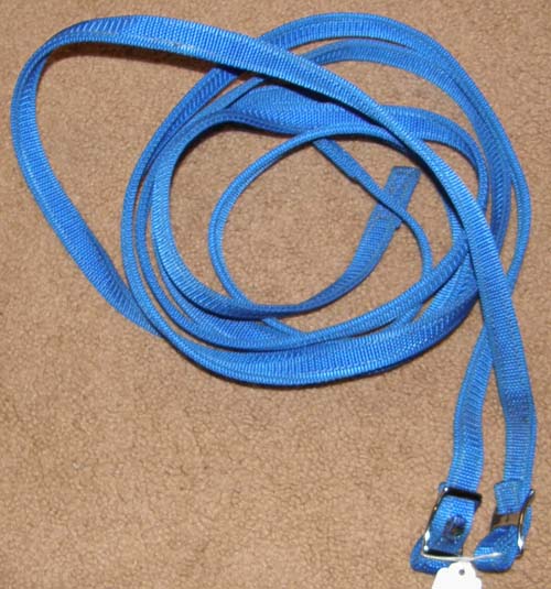 Soft 3/4” nylon reins that have a simple loop through style end with no buckles & measures, almost 6' long. Easy to add snaps on ends for quick changes. Originally came with a Cowboy Tuff/Tuffy headstall, but headstall sold. Excellent condition, only some very minor fraying to edges.