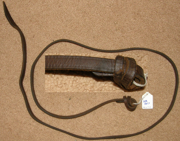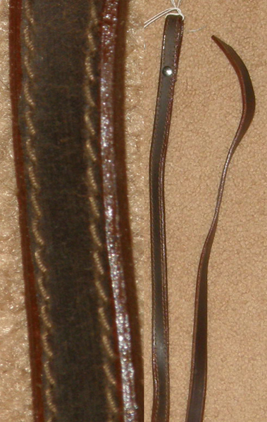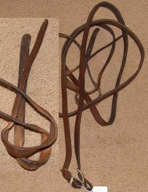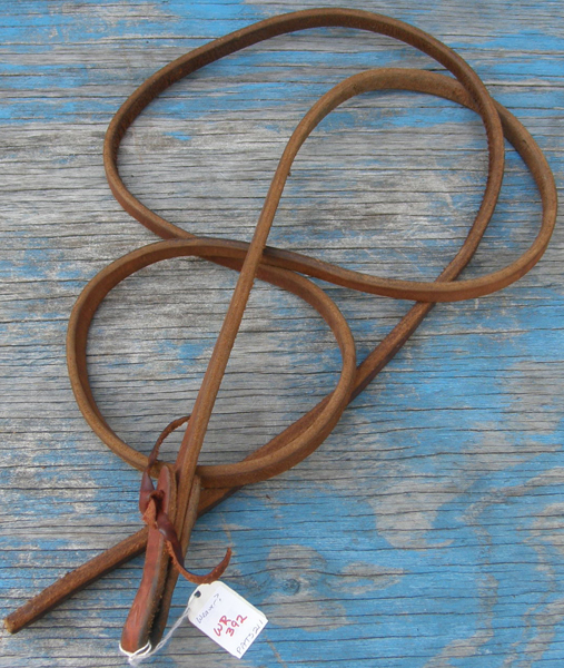 5/8” wide single leather rein with scored edges, old fashioned twist loop at bit end, & is just over 5' long. Soft, flexible, good quality leather. Brand unknown. Great as a replacement rein or make into a short gaming rein for a pony/mini.