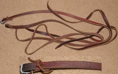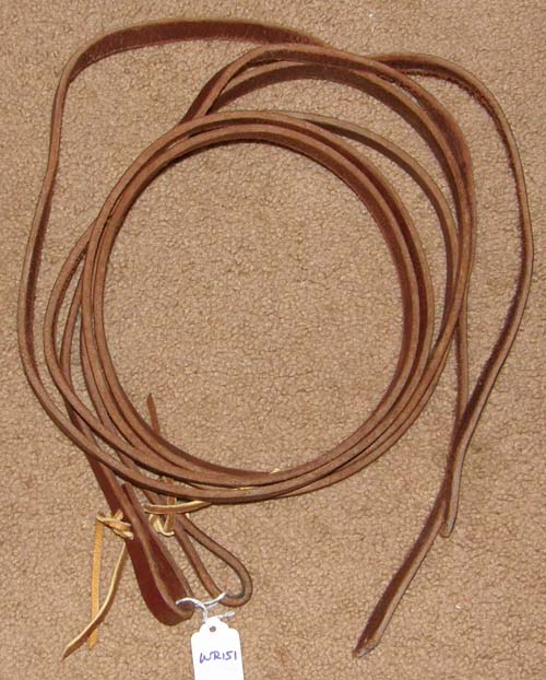 5/8” wide x almost 7 1/2' long leather western reins with rubbed & darkened edges, & has leather ties at bit ends. Brand unknown, but owner bought all equipment from Reinsman & leather drapes nicely in your hands. Some kinks from reins being tied but they are relaxing.