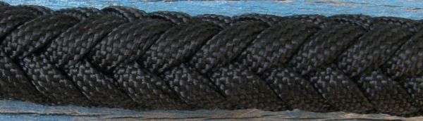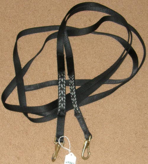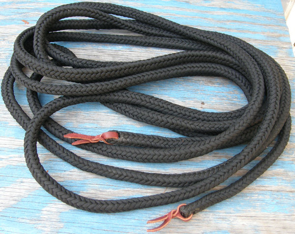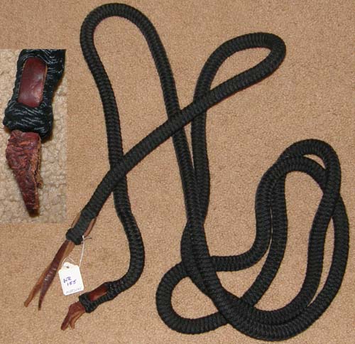 3/4” wide heavy black poly rope reins approx 11 1/2' long with latigo leather string popper ends, so it can be used with snaffle bit or a bosal. Comfortable in your hands, great for breaking young horses. Owner who brought this to us thought it was a natural horsemanship lead, but there is no way to hook in a snap & rope is a little thick to try to tie onto a halter, so would make better reins. Very soft in your hands but is heavy to encourage horse to keep it's head down. Shorter length great for Arabians & shorter necked horses. One end of latigo leather poppers have chew marks. Brand unknown.