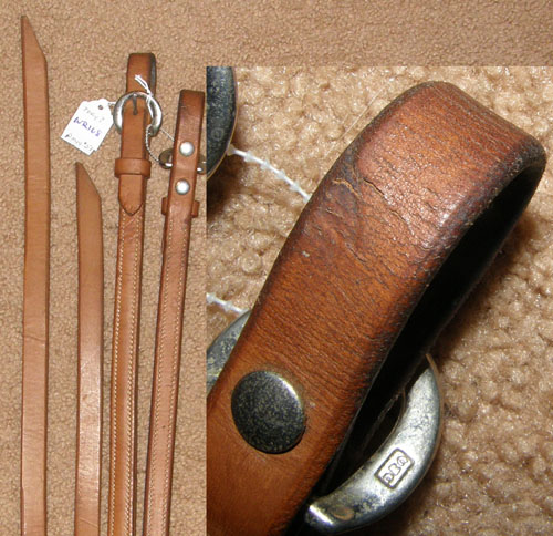 3/4” wide leather western split reins approx 1/4” thick, 6 1/2' long, & brass Conway buckles at bit end. A bit stiff & creases in leather from being tied at one end, but should relax with conditioning or just re-tie them. Brand unknown but good quailty sturdy leather.