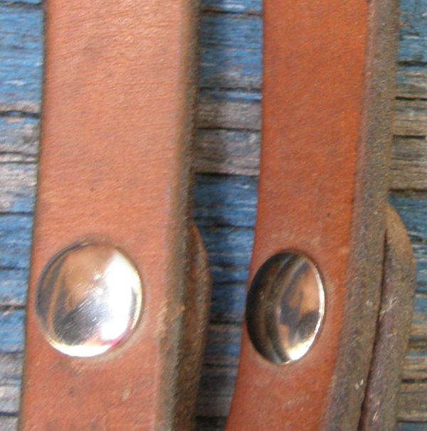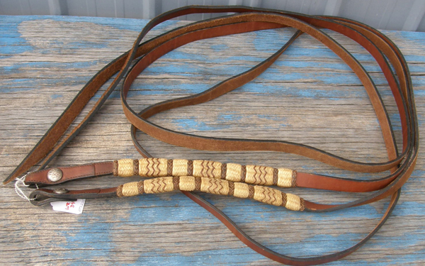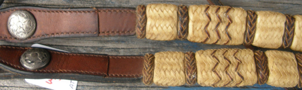 3/4” wide leather Western split reins that are shaped at bit end with engraved silver concho, natural & brown braided rawhide trim, rubbed & darkened edges, & a little over 8 1/2' long. Brand unknown but leather is supple quality leather & braided trim is neat & tight. Silver is not the cheap stuff but don't see any markings.