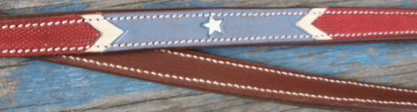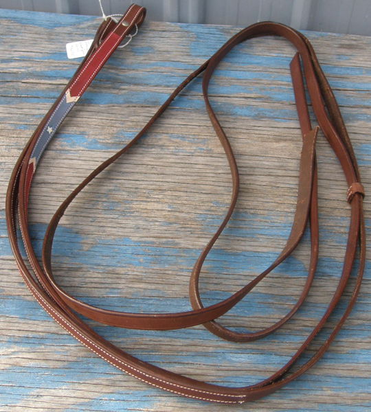 Leather western split reins over 6 1/2' long with rubbed edges, white contrast stitching, red white & blue painted(?) on design with white star on blue field & doubled & stitched 1st 24”, & Chicago screws at bit ends. Nice supple leather reins with sliding keeper. Brand unknown. Would look great for rodeos, parades, etc.