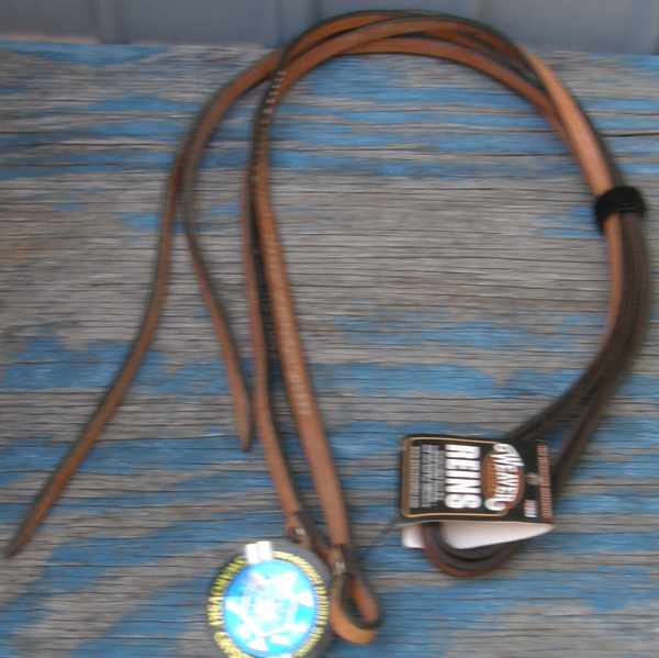 3/4” wide harness leather western split reins with rubbed edges, sliding leather keeper, water loop with trigger/scissor snap ends, & measure 5' long. Brand unknown but leather is supple quality leather & snaps work well. Great for ponies, shorter necked horses or those who don't like a lot of excess rein.