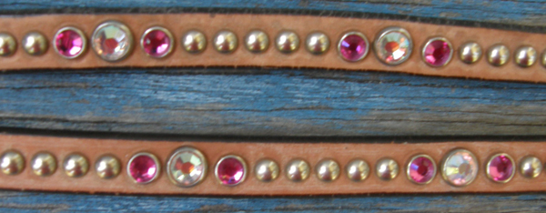 Weaver Leather Pretty in Pink Collection is a favorite with women who ride horses. Rather than excessive amounts of pink tack, just enough bling for good taste is added to great English Bridle leather split reins. Fancy etched Chicago screws at bit ends with light rose Swarovski Crystals set in pewter rings & etched nickel over brass spots give a fashionable flair. Reins measure approx 5/8" wide x 7 1/2'(marked as 7' on tag) in light oil leather with rubbed & darkened edges. New with all tags but wasn't stored the best so some areas of light discoloration to leather which may level out with oiling.