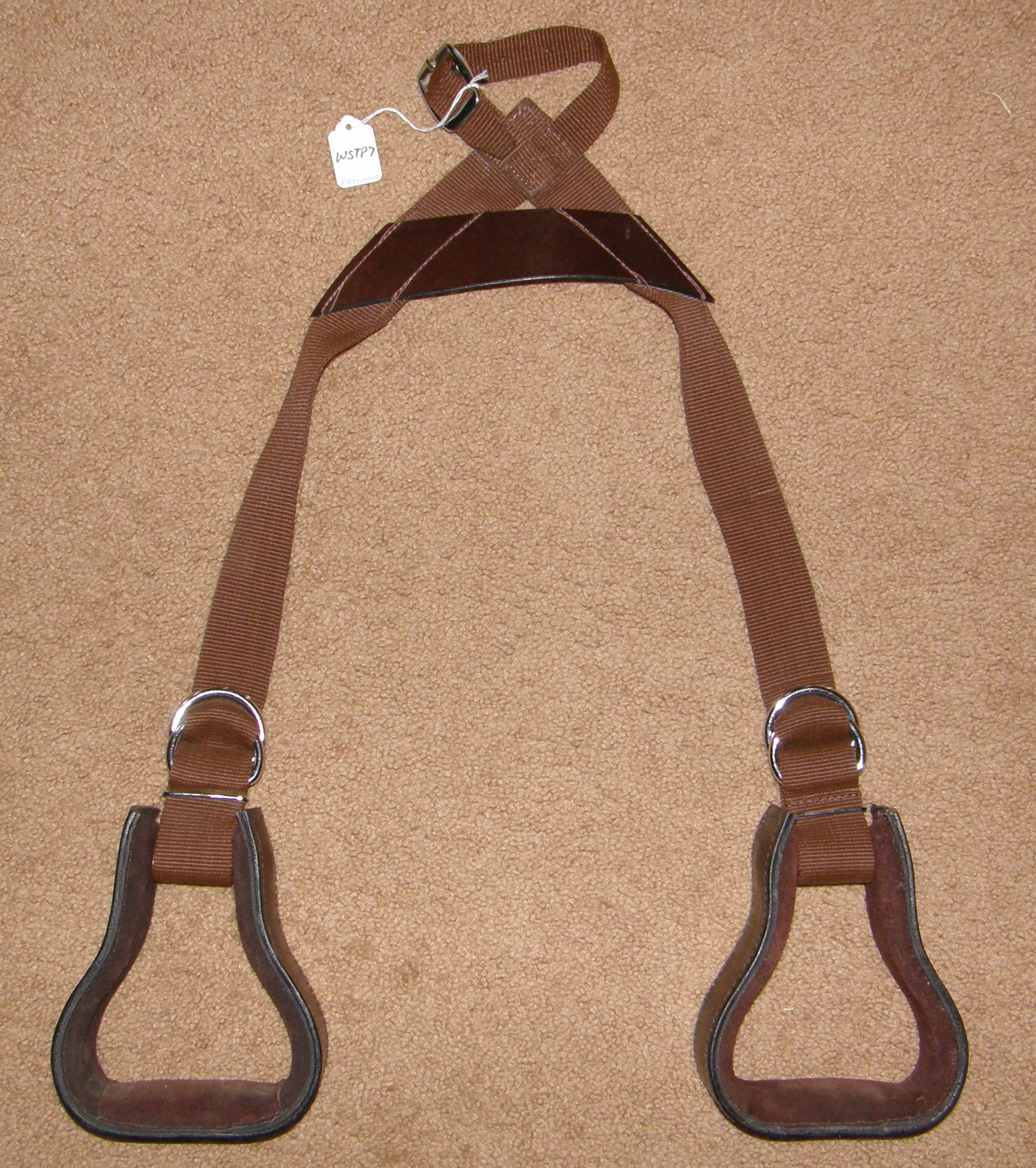 Here's an extra set of stirrups for young riders that are a little "small in the saddle". Just slip these stirrups over the horn of the saddle already on the horse and your child is ready to ride. Made out of heavy duty nylon web & leather bound western stirrups with suede lining & padded treads. Straps adjust to fit a variety of leg lengths. A quality made item. Brand unknown.